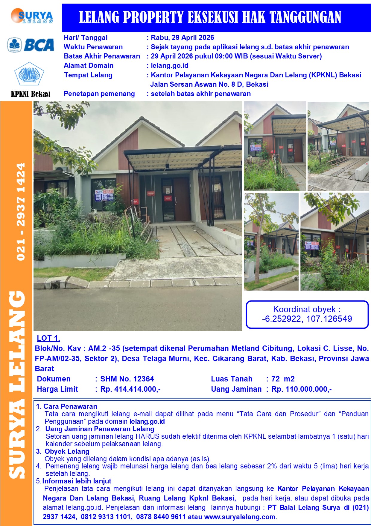 Sebidang tanah seluas 72 m2 berikut bangunan sesuai SHM No. 12364, terletak di Blok/No. Kav : AM.2 -35 (setempat dikenal Perumahan Metland Cibitung, Lokasi C. Lisse, No. FP-AM/02-35, Sektor 2), Desa Telaga Murni, Kec. Cikarang Barat, Kab. Bekasi, Provinsi Jawa Barat
