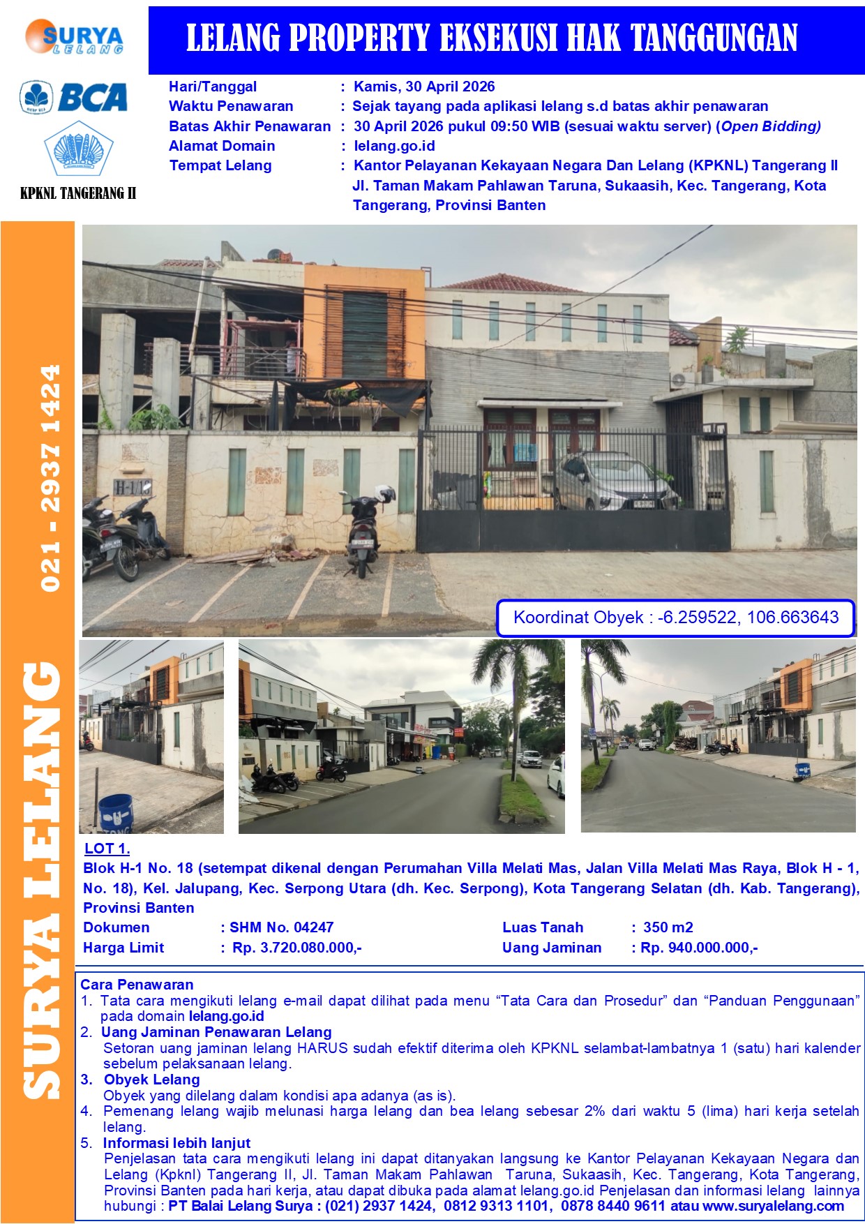 Sebidang tanah seluas 350 m2 berikut bangunan sesuai SHM No. 04247/Jalupang, terletak di Blok H-1 No. 18, Kel. Jalupang, Kec. Serpong, Kab. Tangerang, Propinsi Banten (sesuai sertipikat);