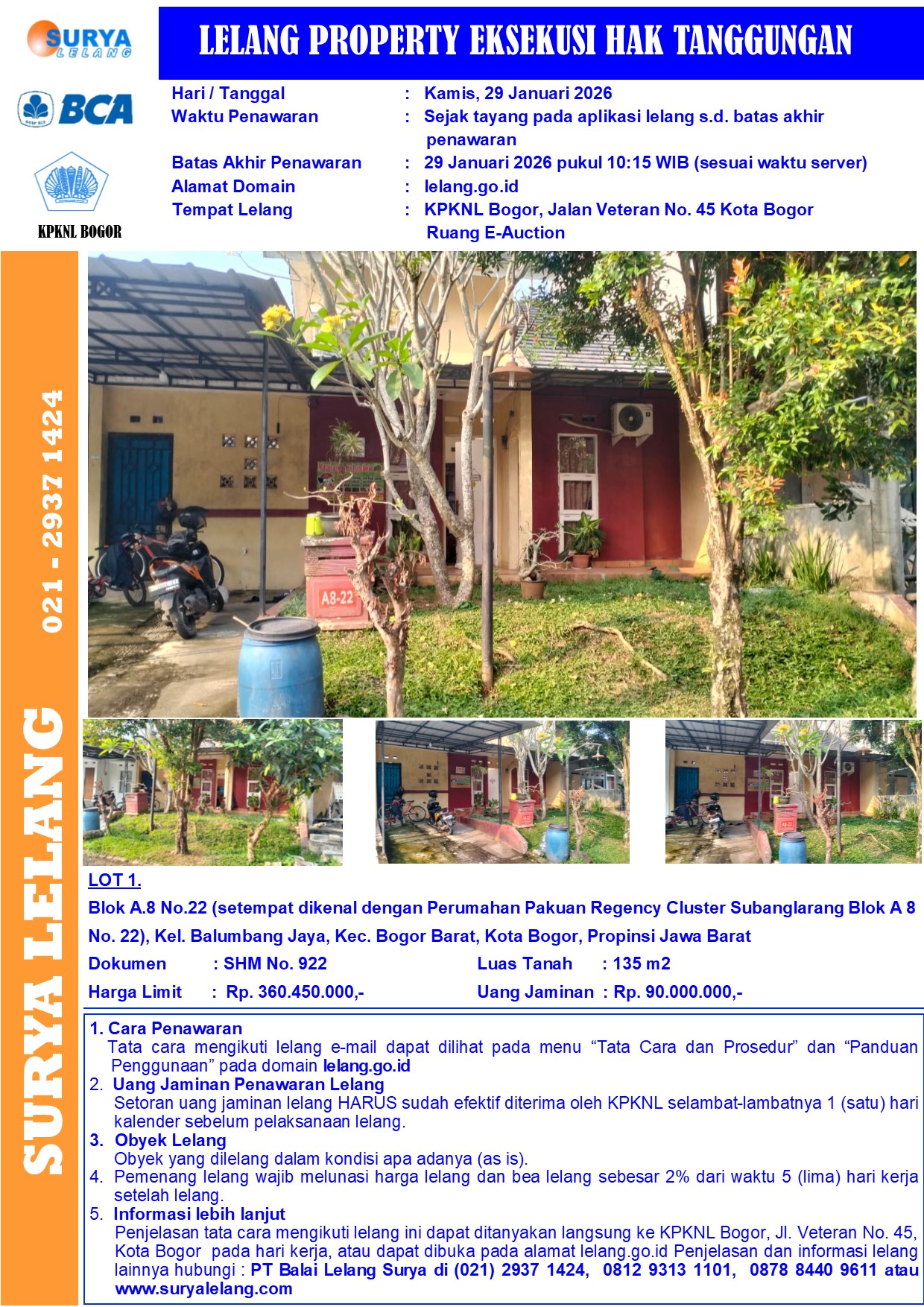 Sebidang tanah seluas 135 m2 berikut bangunan sesuai SHM No. 922, terletak di Blok A.8 No.22 (setempat dikenal dengan Perumahan Pakuan Regency Cluster Subanglarang Blok A 8 No. 22), Kel. Balumbang Jaya, Kec. Bogor Barat, Kota Bogor, Provinsi Jawa Barat