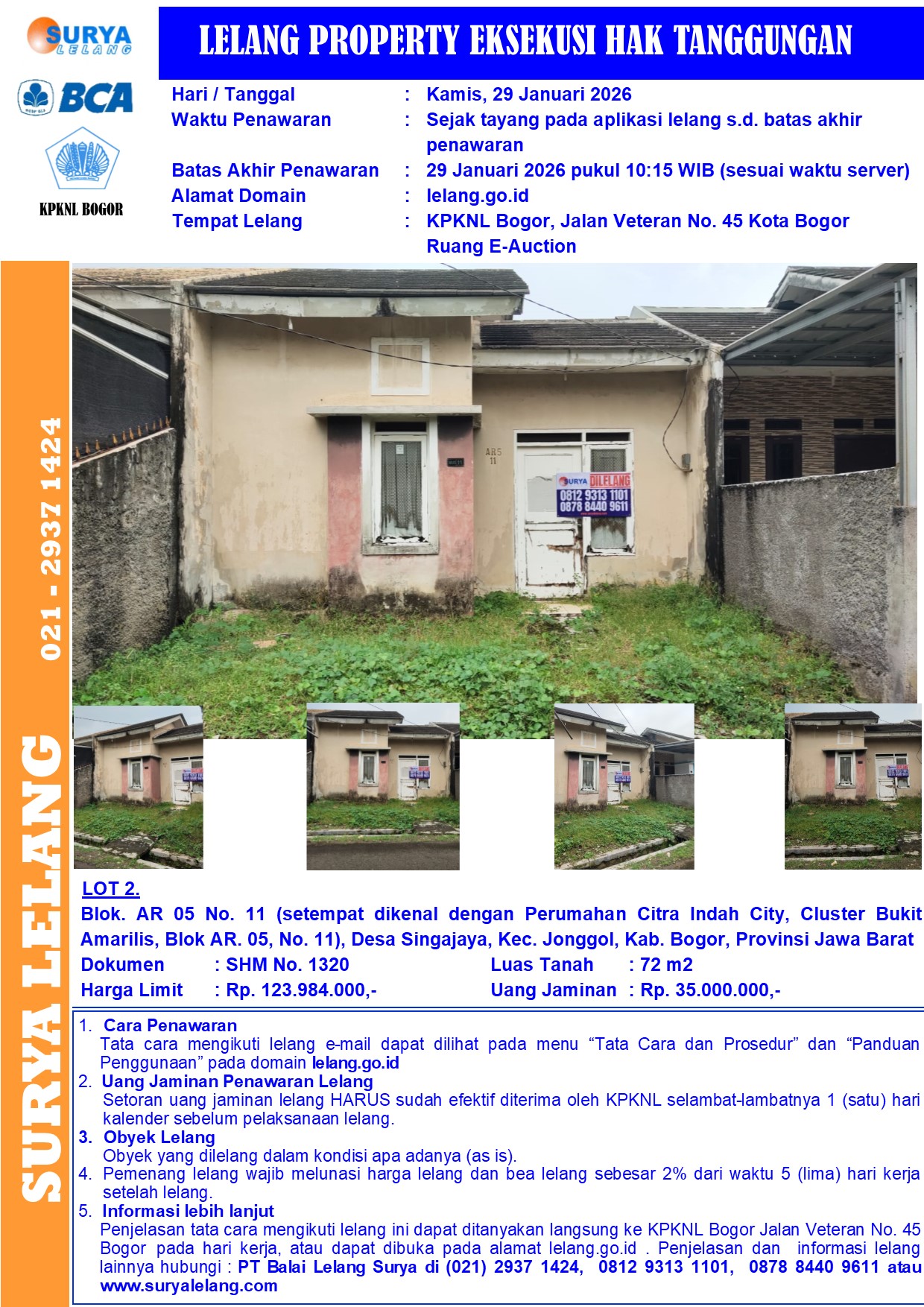 Sebidang tanah seluas 72 m2 berikut bangunan sesuai SHM No. 1320, terletak di Blok. AR 05 No. 11 (setempat dikenal dengan Perumahan Citra Indah City, Cluster Bukit Amarilis, Blok AR. 05, No. 11), Desa (dh. Desa/Kel) Singajaya, Kec. Jonggol, Kab. Bogor, Propinsi Jawa Barat