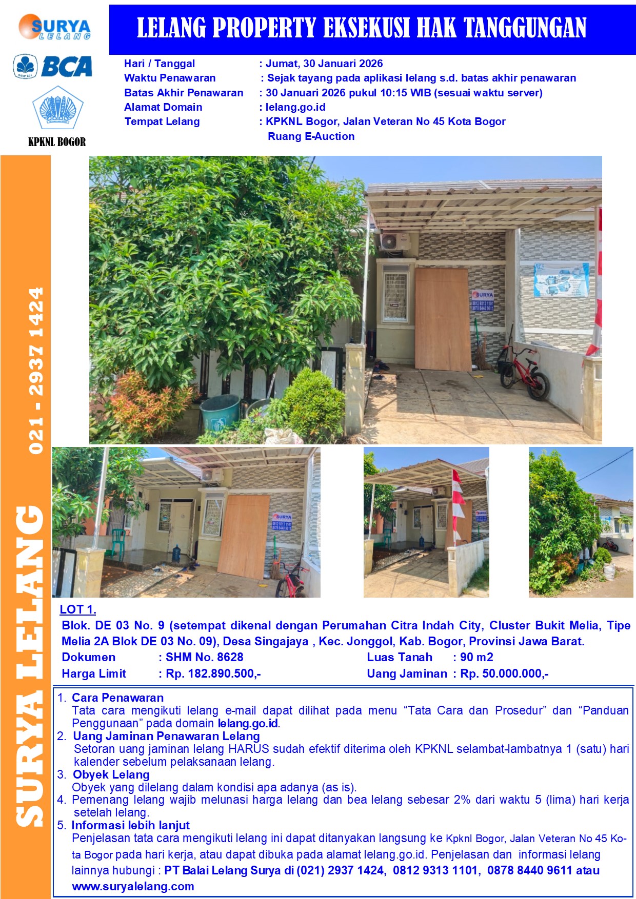 Sebidang tanah seluas 90 m2 berikut bangunan sesuai SHM No. 8628, terletak di Blok. DE 03 No. 9 (setempat dikenal dengan Perumahan Citra Indah City, Cluster Bukit Melia, Tipe Melia 2A Blok DE 03 No. 09), Desa Singajaya , Kec. Jonggol, Kab. Bogor, Provinsi Jawa Barat