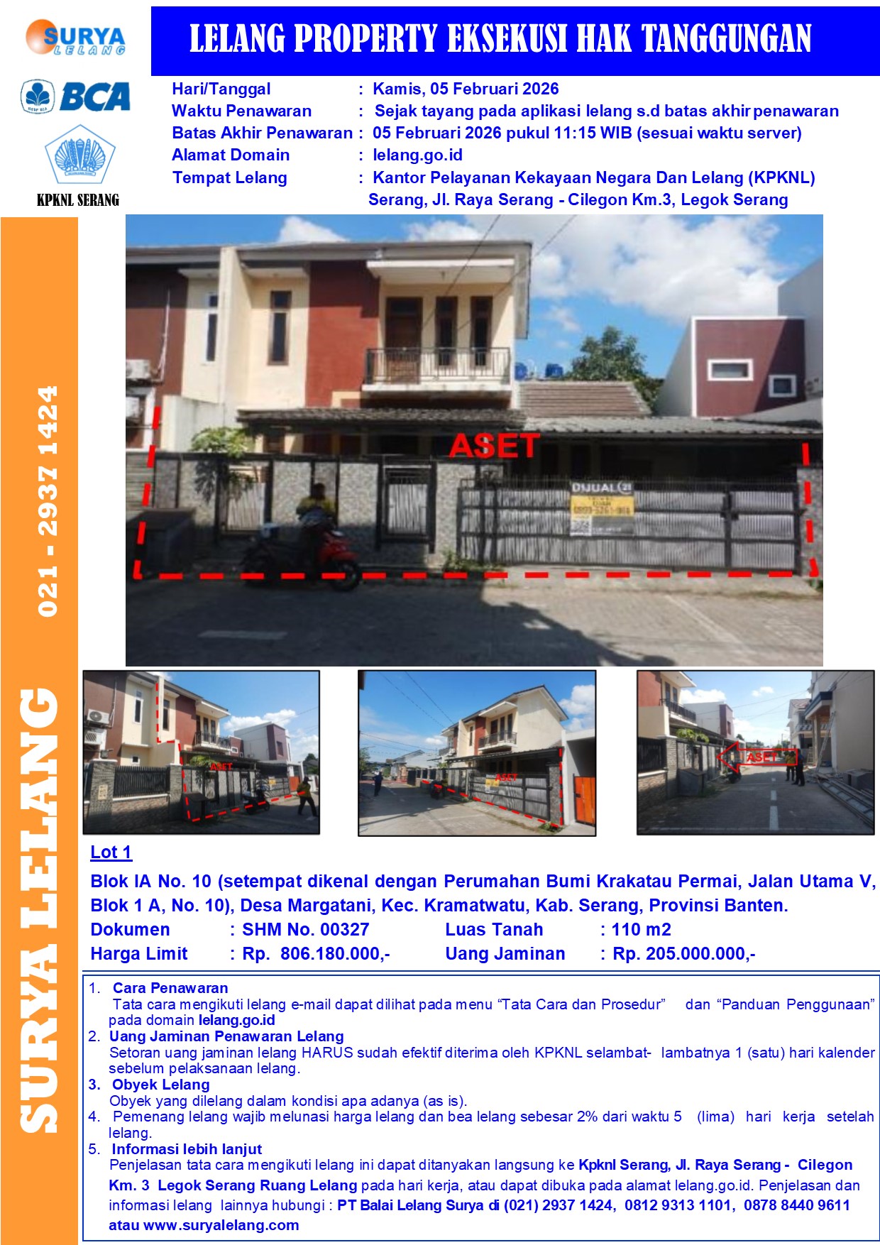 Sebidang tanah seluas 110 m2 berikut bangunan sesuai SHM No. 00327, terletak di Blok IA No. 10 (setempat dikenal dengan Perumahan Bumi Krakatau Permai, Jalan Utama V, Blok 1 A, No. 10), Desa Margatani, Kec. Kramatwatu, Kab. Serang, Provinsi Banten