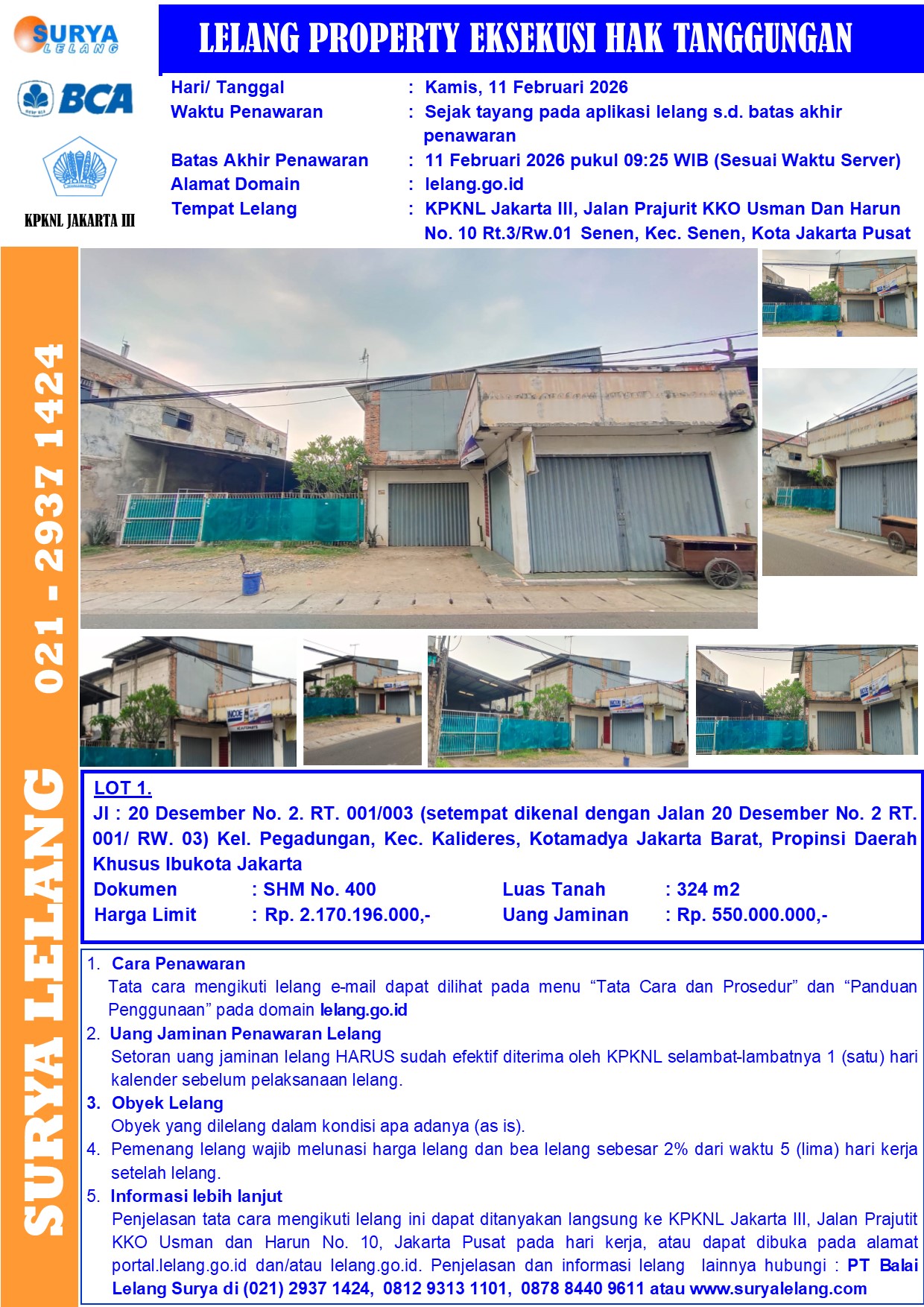 Sebidang tanah seluas 324 m2 berikut bangunan sesuai SHM No. 400, terletak di Jl : 20 Desember No. 2. RT.001/003 (setempat dikenal dengan Jalan 20 Desember No. 2 RT. 001 / RW. 03) Kel. Pegadungan, Kec. Kalideres, Kotamadya Jakarta Barat, Propinsi Daerah Khusus Ibukota Jakarta