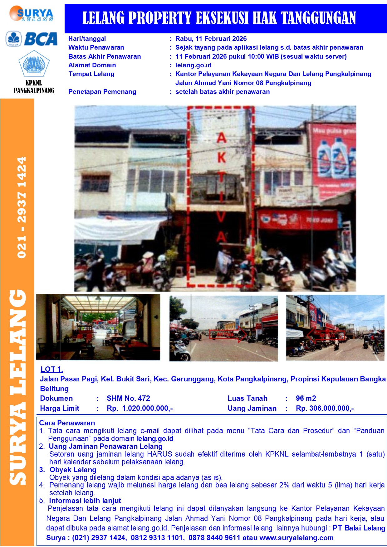 Sebidang tanah seluas 96 m2 berikut bangunan sesuai SHM No. 472, setempat dikenal dengan Jalan Pasar Pagi, Kel. Bukit Sari, Kec. Gerunggang, Kota Pangkalpinang, Propinsi Kepulauan Bangka Belitung