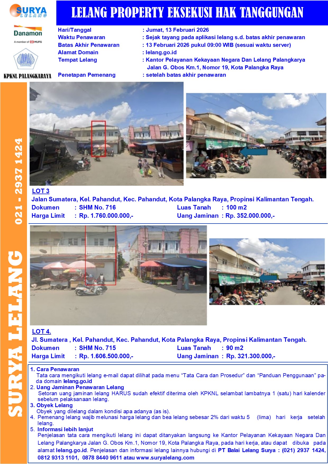Sebidang tanah seluas 100 m2 berikut bangunan sesuai SHM No. 716, terletak di Jalan Sumatera, Kel. Pahandut, Kec. Pahandut, Kota Palangka Raya, Propinsi Kalimantan Tengah