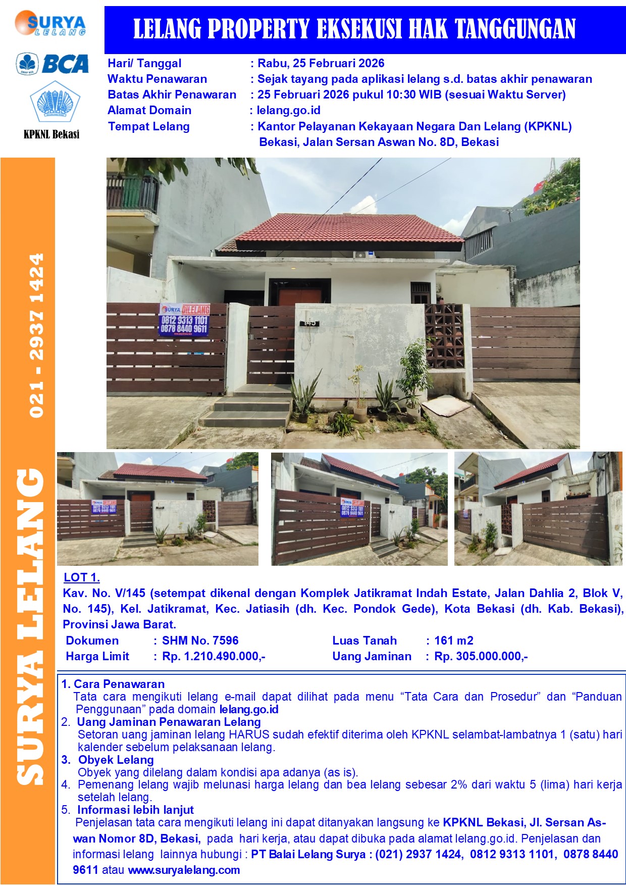Sebidang tanah seluas 161 m2 berikut bangunan sesuai SHM No. 7596, terletak di Kav. No. V/145 (setempat dikenal dengan Komplek Jatikramat Indah Estate, Jalan Dahlia 2, Blok V, No. 145), Kel. Jatikramat, Kec. Jatiasih (dh. Kec. Pondok Gede), Kota Bekasi (dh. Kab. Bekasi), Provinsi Jawa Barat