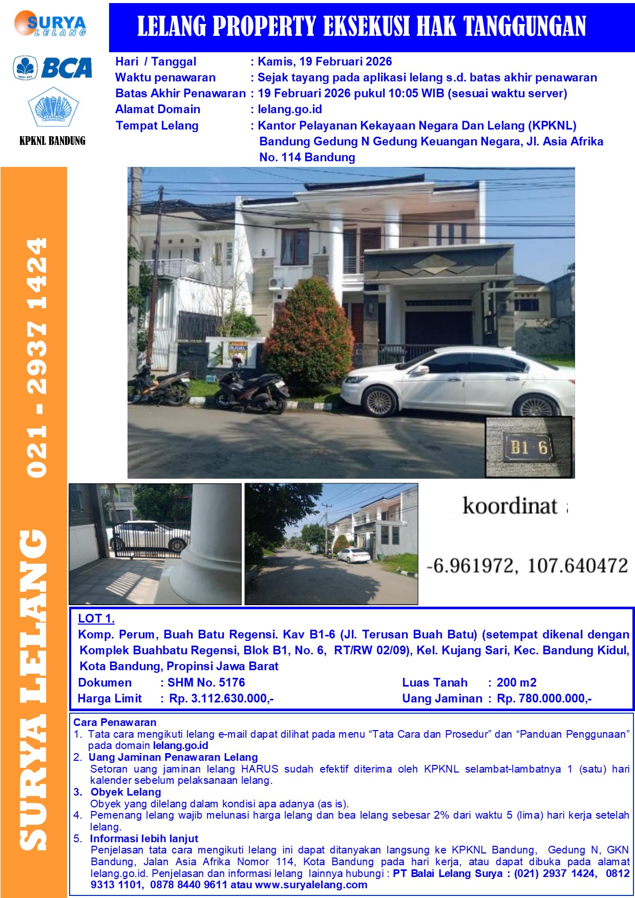 1 (satu) bidang tanah, SHM No. 5176, luas 200 m2, berikut bangunan rumah tinggal dan segala sesuatu diatasnya, terletak di Komp. Perum, Buah Batu Regensi. Kav B1-6 (Jl. Terusan Buah Batu) (setempat dikenal dengan Komplek Buahbatu Regensi, Blok B1, No. 6, RT/RW 02/09), Kel. Kujang Sari, Kec. Bandung Kidul, Kota Bandung, Propinsi Jawa Barat