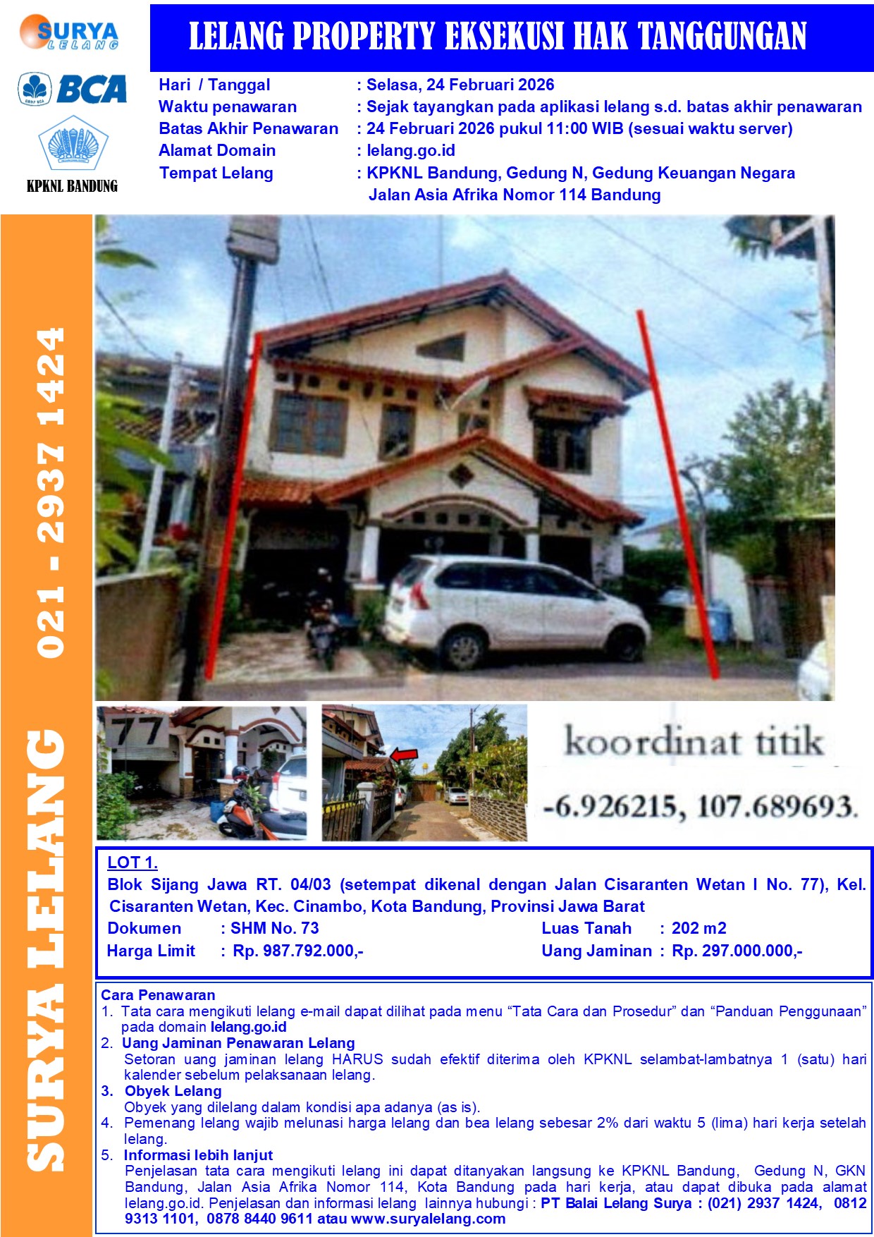 Sebidang tanah seluas 202 m2 berikut bangunan sesuai SHM No. 73, terletak di Blok Sijang Jawa RT. 04/03 (setempat dikenal dengan Jalan Cisaranten Wetan I No. 77), Kel. Cisaranten Wetan, Kec. Cinambo, Kota Bandung, Propinsi Jawa Barat