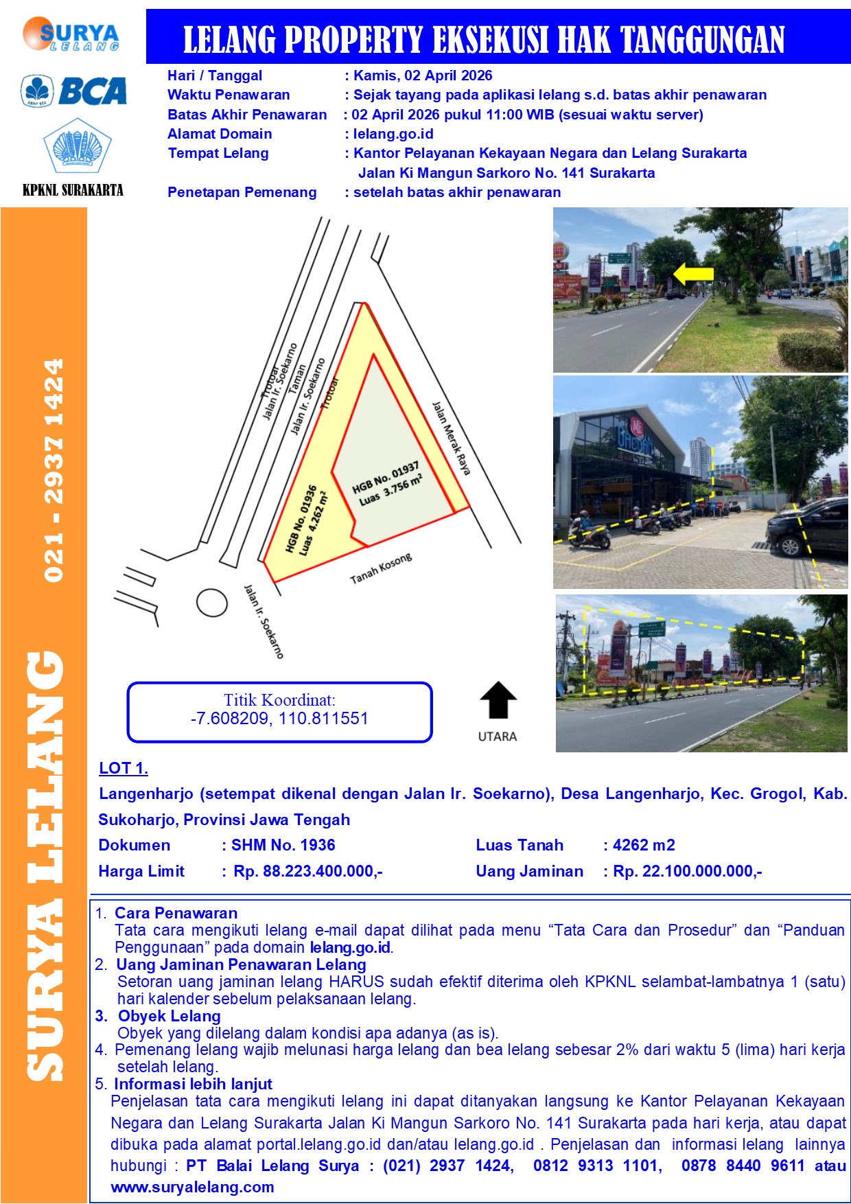 Sebidang tanah seluas 4262 m2 sesuai SHGB No. 1936, terletak di Langenharjo (setempat dikenal dengan Jalan Ir. Soekarno), Desa Langenharjo, Kec. Grogol, Kab. Sukoharjo, Provinsi Jawa Tengah