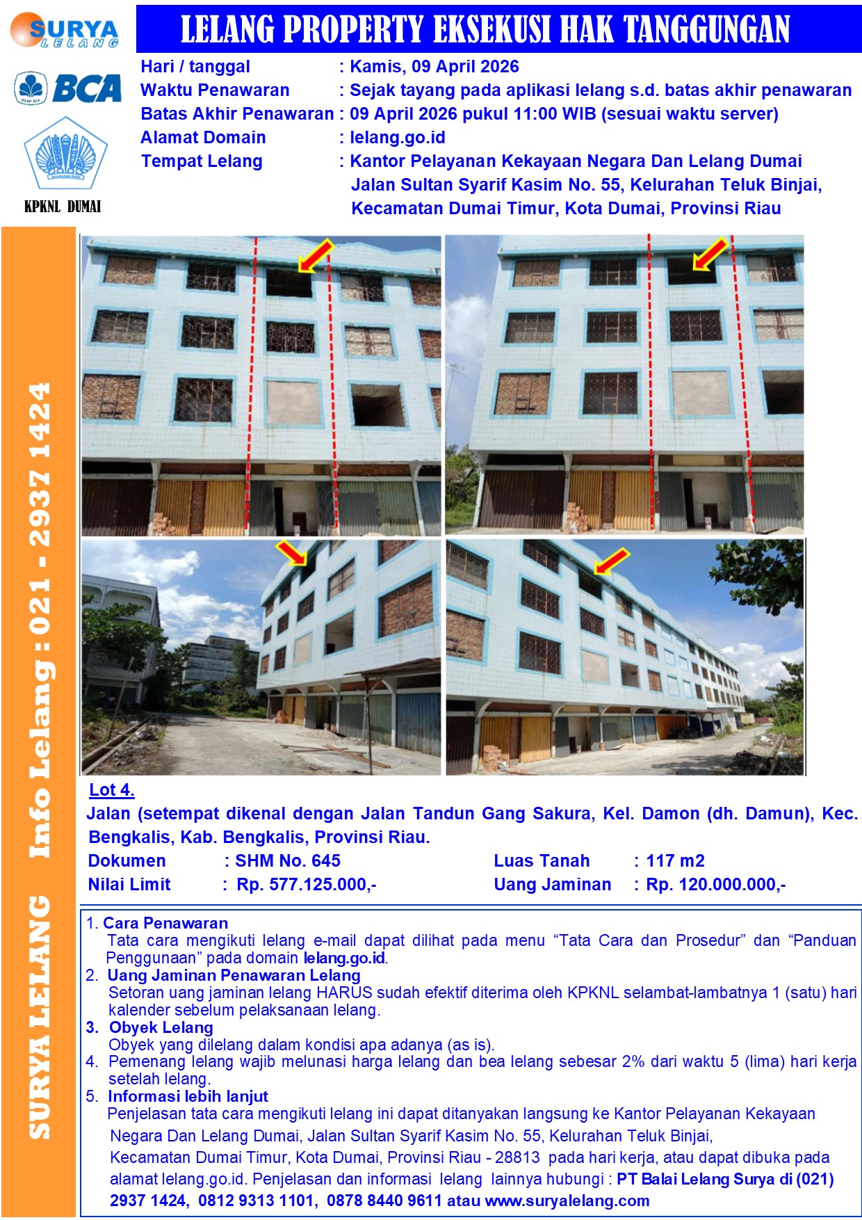 Sebidang tanah seluas 117 m2 berikut bangunan diatasnya terletak di Jalan (setempat dikenal dengan Jalan Tandun Gang Sakura, Kel. Damon (dh. Damun), Kec. Bengkalis, Kab. Bengkalis, Provinsi Riau, bukti kepemilikan Sertipikat Hak Milik No. 645, tanggal penerbitan sertipikat 23 Maret 2006