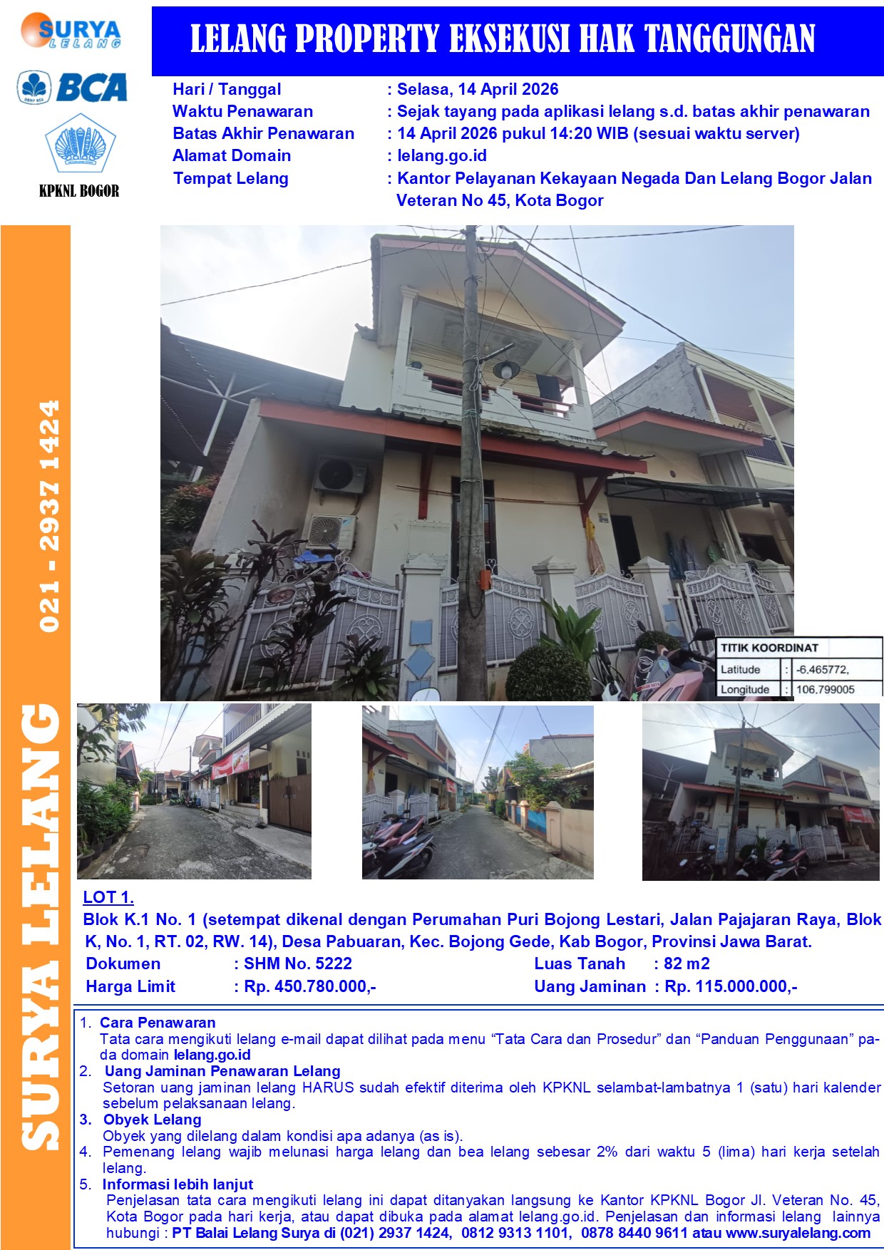 Sebidang tanah seluas 82 m2 berikut bangunan sesuai SHM No. 5222, terletak di Blok K.1 No. 1 (setempat dikenal dengan Perumahan Puri Bojong Lestari, Jalan Pajajaran Raya, Blok K, No. 1, RT. 02, RW. 14), Desa (dh. Desa/Kel) Pabuaran, Kec. Bojong Gede, Kab Bogor, Provinsi Jawa Barat