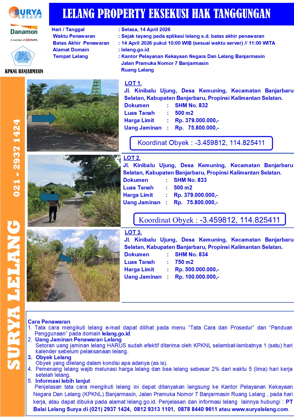 Satu bidang tanah kosong seluas 500 m2 sesuai Sertipikat Hak Milik nomor 832 tanggal 11 Mei 1982, terletak di Jl. Kinibalu Ujung, Desa Kemuning, Kecamatan Banjarbaru Selatan, Kabupaten Banjarbaru, Propinsi Kalimantan Selatan