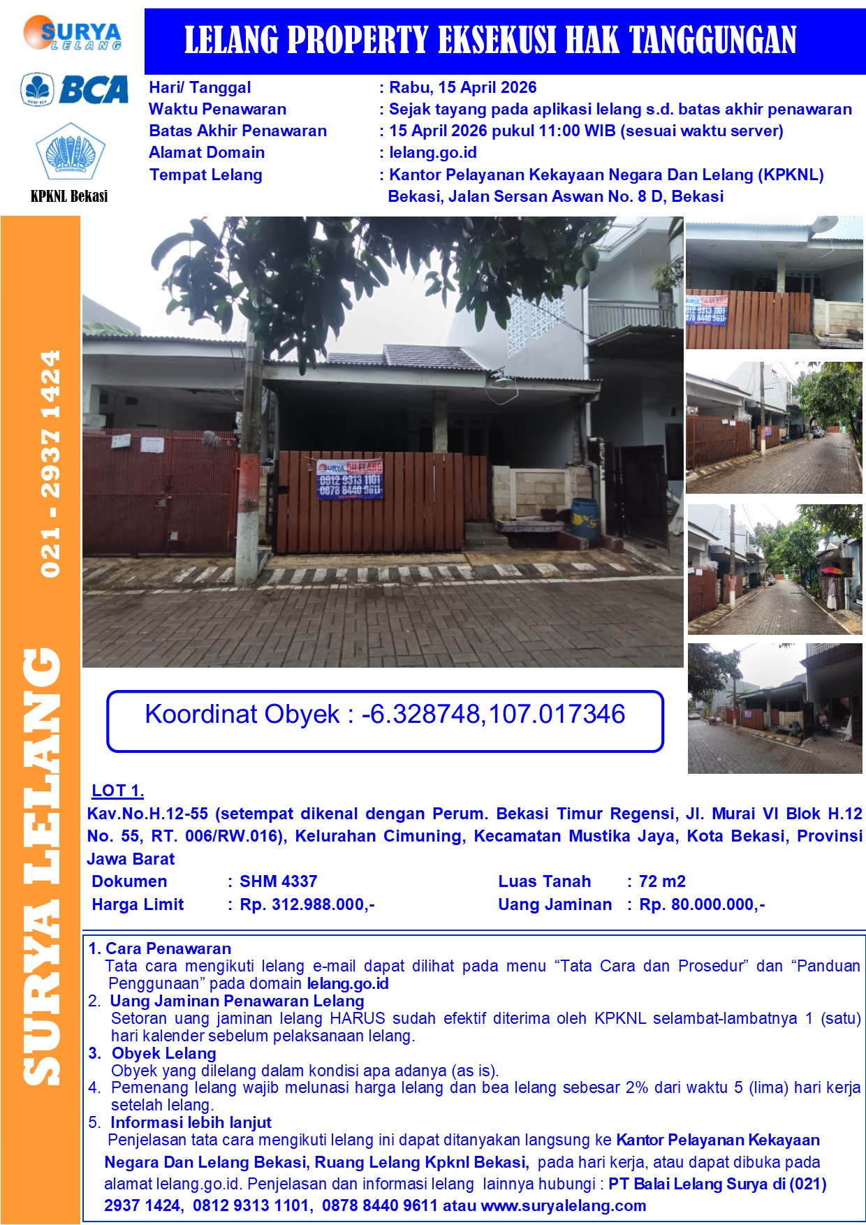 Sebidang tanah seluas 72 m2 berikut bangunan sesuai SHM No. 4337, terletak di Kav.No.H.12-55 (setempat dikenal dengan Perum. Bekasi Timur Regensi, Jl. Murai VI Blok H.12 No. 55, RT. 006/RW.016), Kelurahan Cimuning, Kecamatan Mustika Jaya, Kota Bekasi, Propinsi Jawa Barat