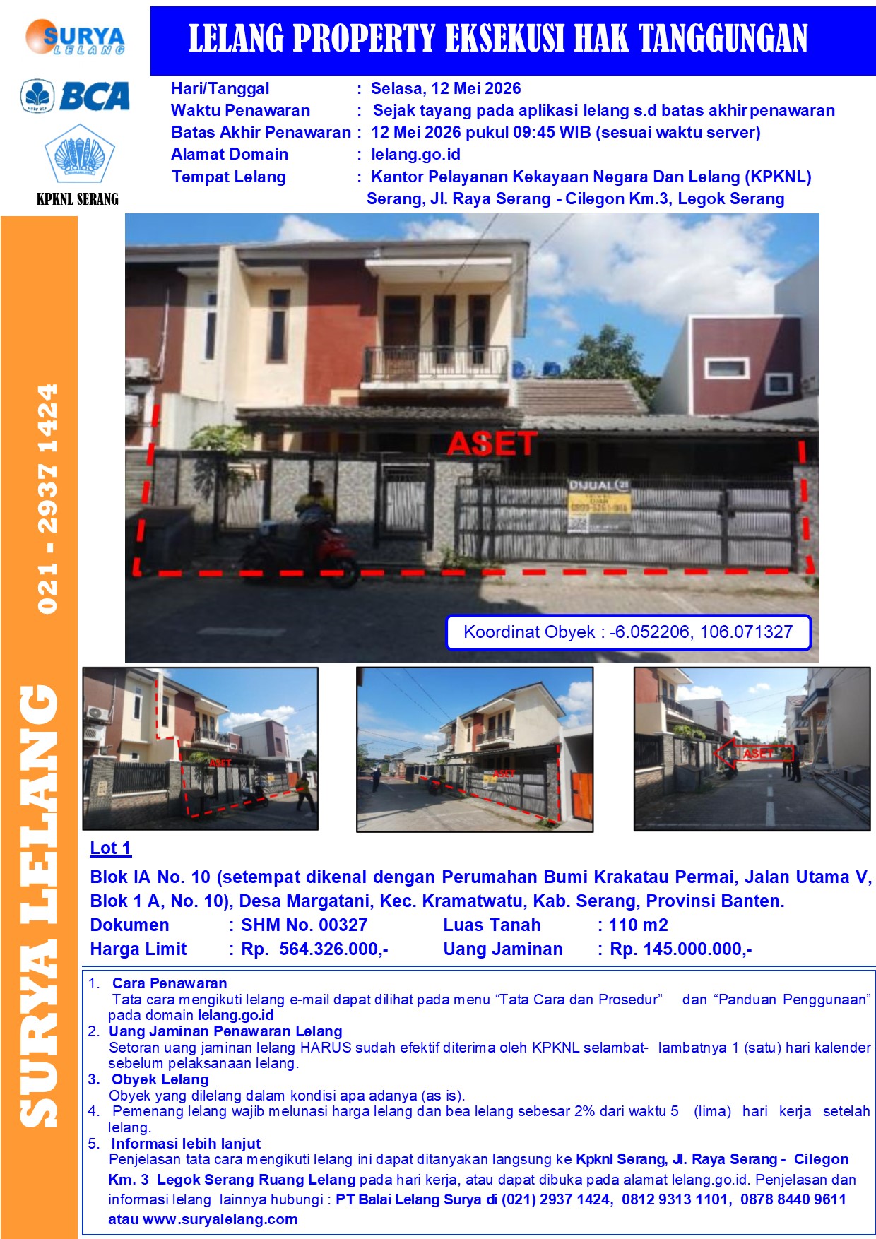 Sebidang tanah seluas 110 m2 berikut bangunan sesuai SHM No. 00327, terletak di Blok IA No. 10 (setempat dikenal dengan Perumahan Bumi Krakatau Permai, Jalan Utama V, Blok 1 A, No. 10), Desa Margatani, Kec. Kramatwatu, Kab. Serang, Provinsi Banten